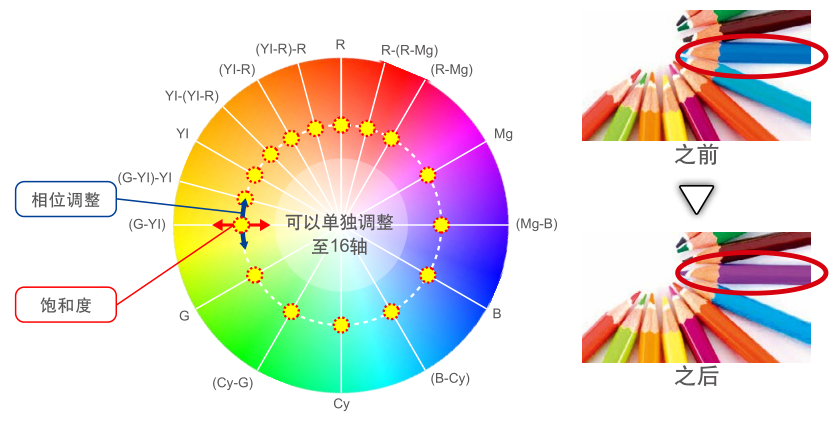 ●16轴独立颜色校正 : 视频图像的16阶独立的效果。其能在同等照明条件下匹配多台摄像机,并能实现独具匠心的图像渲染效果。