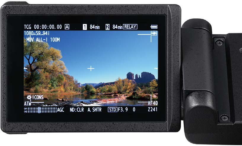 本款LCD显示屏采用RGBW (红、绿、蓝、白)像素结构,而不论是否在明亮的阳光下都可提供高可见度。3:2宽高比显示时间码和摄像机状态,而不会叠加在图像上。触摸屏功能可以方便的触摸焦点和菜单设置。高分辨率彩色OLED寻像器(约达236万像素,图像显示面积约达177万像素),提供与众不同的色彩还原效果。由于AJ-UPX360MC最新支持LCD和寻像器同时输出,因此LCD显示屏可以随时显示捕获的图像,而不论是否监看寻像器。