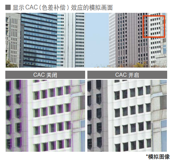 此功能对应镜头成像边缘因色散产生的模糊,特有的高精度算法,能够对镜头色散误差自动进行补偿,修正图像边缘的色散*3和模糊 。