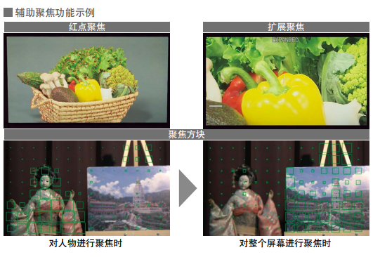 聚焦辅助功能支持快速准确的聚焦,例如聚焦条(指示聚焦水平),红点聚焦(使用颜色指示聚焦区域),MAG(放大中央部分)和全局方块指示(显示整体屏幕上的聚焦状态)。同时支持具备自动聚焦和聚焦辅助功能的镜头* 1。使用数字镜头时,通过远程操作面板(ROP)可对聚焦和变焦进行远程遥控。