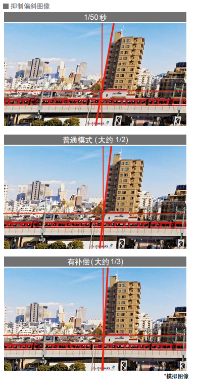 摄像机的普通和低扭曲模式的MOS传感器读取速度分别是标准摄像机模式的1/2和1/3 (1/50秒) 。通过高速读取MOS传感器方式,能够有效抑制MOS传感器图像信号的扭曲特性。