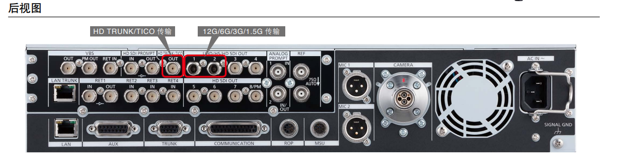 摄像机输出、RET输入、高清中继输出、高清提示输入、音频输出、内部通话、PGM输入、ST2059(PTP)、TALLY (TSL UMD 5.0 IP)
