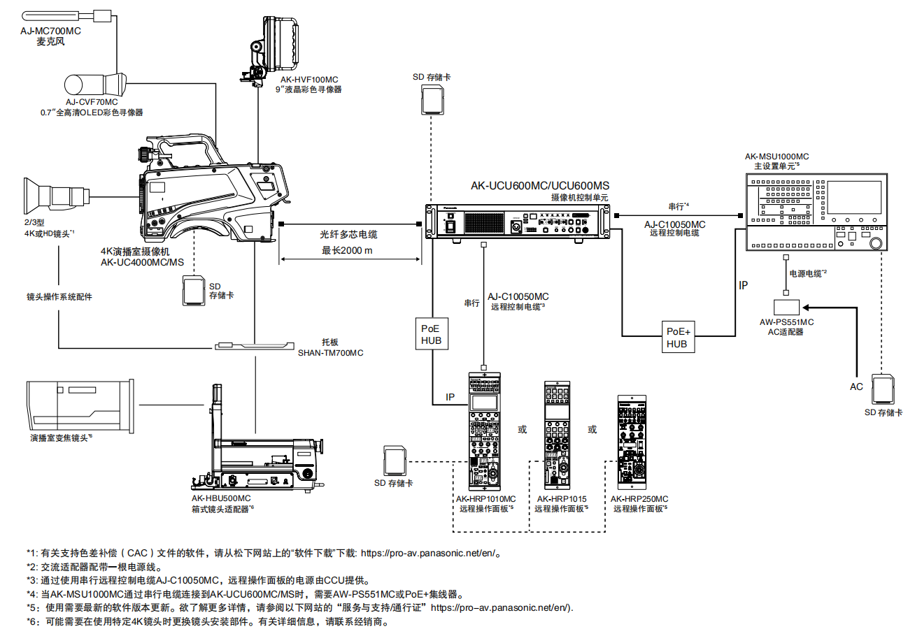 AK-UCU600MC/MS摄像机控制单元(CCU)采用非压缩的4K/HD视频信号传输技术,通过光纤可实现长距离传输。AK-HRP1010MC/HRP1015远程操作面板 (ROP) 配备高可视性彩色液晶面板。还具有一系列快速响应的功能,包括AK-HRP1010MC配备彩色液晶触摸屏。系统不仅可拍摄高质量视频,且操作性极佳。摄像机控制单元(CCU)供电,可在摄像机与摄像机控制单元(CCU)对视频信号进行长距离传输,传输距离可达约2,000m。通过对摄像机局部供电,并使用通用单模光纤,可以将传输距离扩展到10,000m*1。在CCU和ROP之间,除了使用专用的串行线路外,还支持通过LAN电缆进行IP连接。